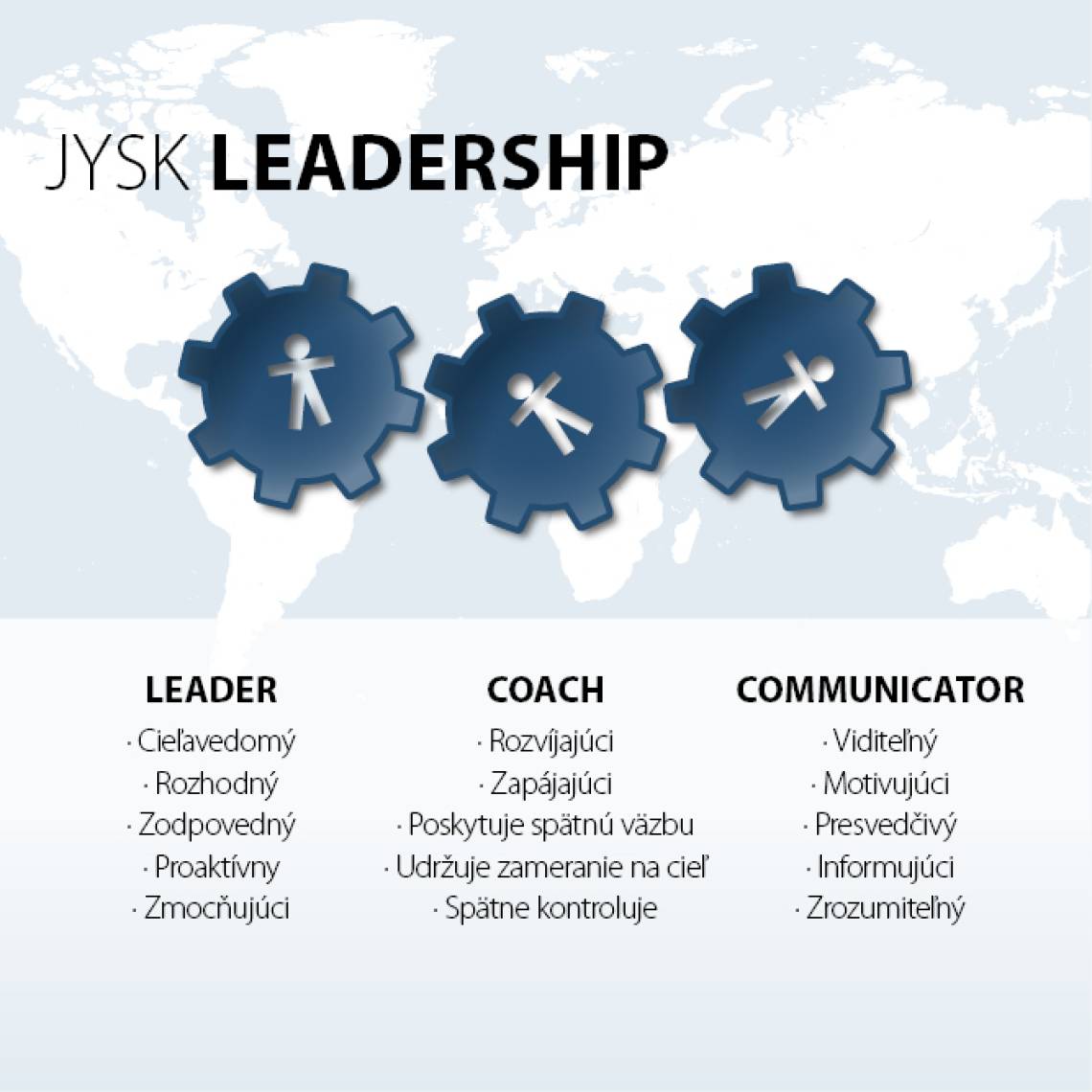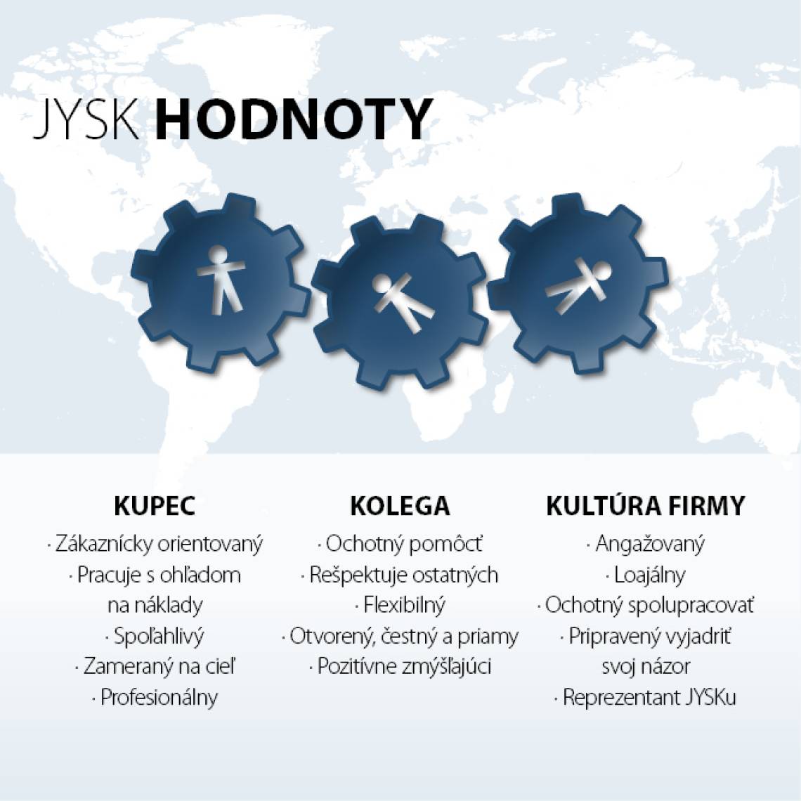 Naše JYSK hodnoty a JYSK Leadership vytvárajú rámec vzájomného správania sa medzi kolegami v JYSKu rovnako ako určujú náš prístup k našim externým partnerom. Naše tri základné JYSK hodnoty – Kupec, Kolega a Kultúra firmy – pochádzajú od nášho zakladateľa Larsa Larsena. Vyjadrujú správanie a prístup, ktoré môžeme očakávať jeden od druhého. Okrem napĺňania našich základných hodnôt od lídra v JYSKu očakávame, že bude zosobňovať aj JYSK Leadership, a teda bude skvelý Leader, Coach a Communicator.